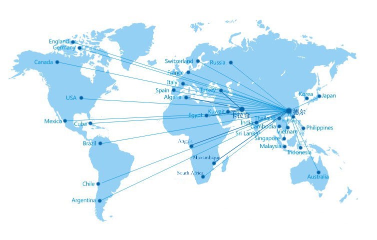 全世界各個國家和地區。目前占有市場:中國、美國、東南亞、中東、北非、南美等。至2018年11月,我們的市場除了在中國銷售到25個省份之外,還進入了美國、印度尼西亞、馬來西亞、孟加拉國、斯裏蘭卡、越南、巴基斯坦、卡塔爾、阿爾及利亞、安哥拉、莫桑比克、智利等12個國家。